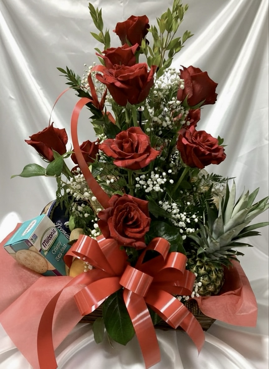 Love in basquet with asserted cookies and fruit Red Roses G1-42047
