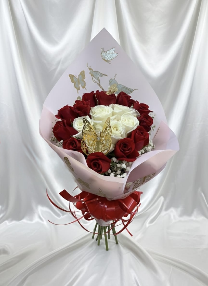 White Roses with red roses perimeter one golden Butterfly G1-42050